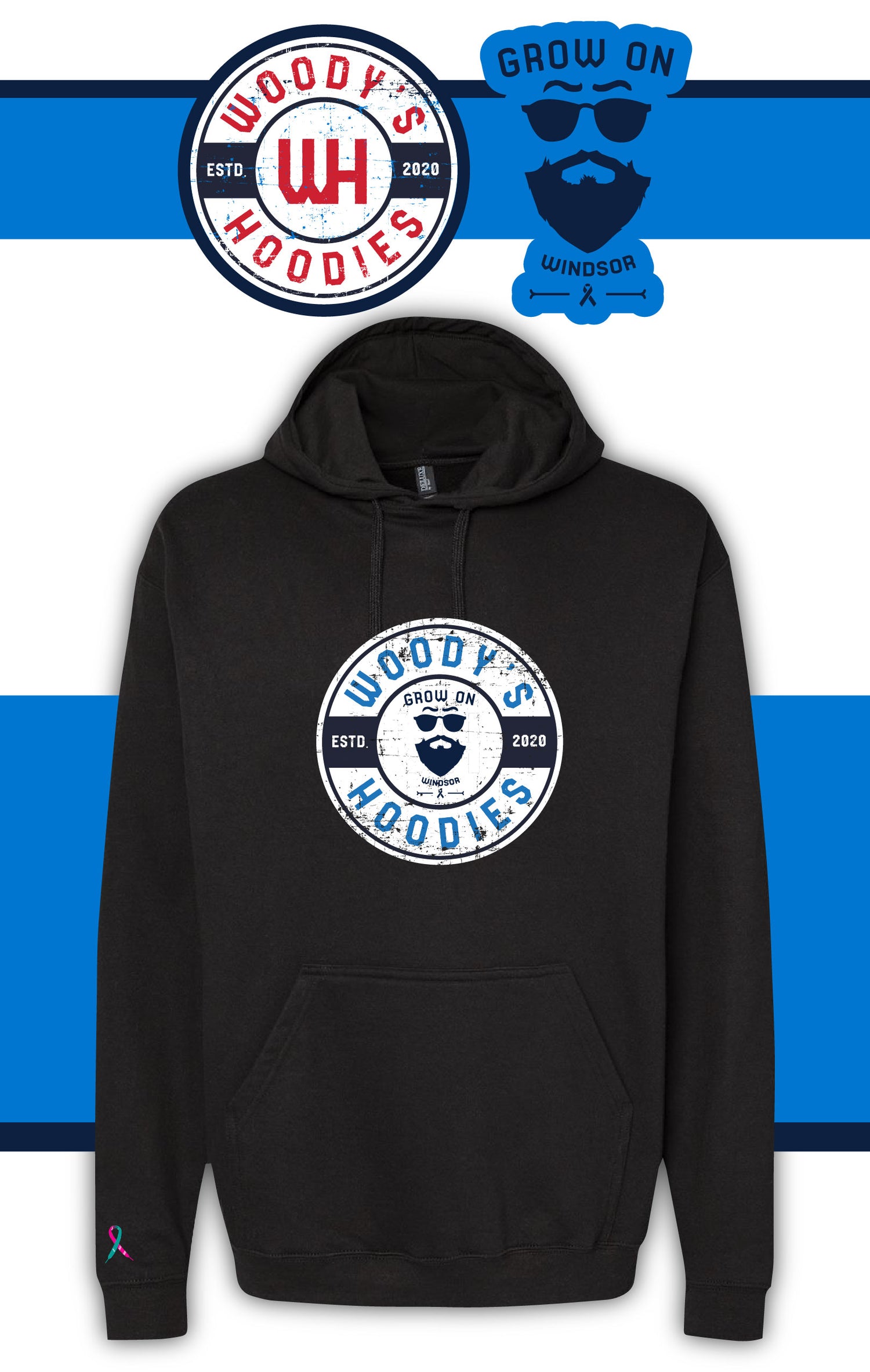 Every Woody's Hoodie features a custom ribbon that combines the symbols representing breast cancer and ovarian cancer. The ribbon is prominently displayed on the right sleeve, symbolizing unity and support during handshake lineups at hockey games.